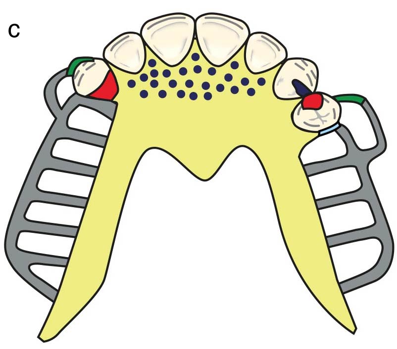 - When an edentulous space exists in the anterior region, a U-shaped plate, a modified anteroposterior bar with an extended anterior segment, or a complete palatal plate is indicated. Key factors in decision-making include the number and location of missing posterior teeth, the periodontal support of the remaining teeth, and the type of opposing occlusion.