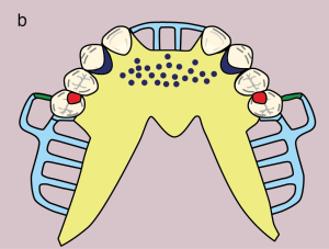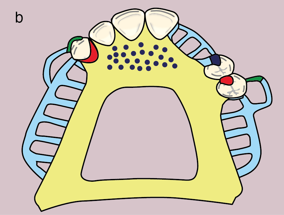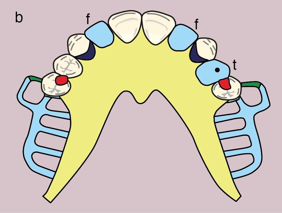 Şekil 11.8. a) Cl I Mod 1: 14 ve 25 no’lu terminal desteklerden geçen diagonal fulkrum ekseni. b) Metal alt yapı planı