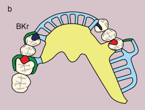 Şekil 11.19. a) Cl II Mod 1: 24 ve 17 no’lu terminal desteklerden geçen diagonal fulkrum ekseni. b) Metal alt yapı planı